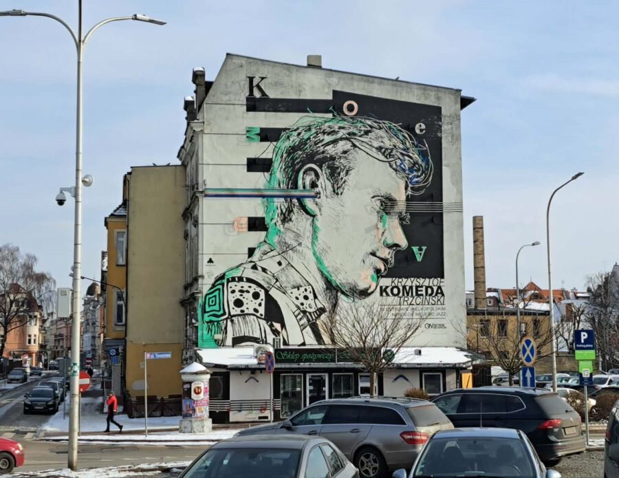 Podróżowałam z przesiadką w Ostrowie Wielkopolskim. A tam wreszcie udało mi się sfotografować mural Krzysztofa Komedy Trzcińskiego.