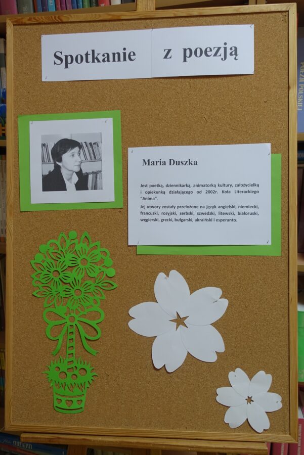 A 22 października spotkałam się z uczniami Powiatowego Zespołu Szkół nr 1 w Sieradzu. Tutaj udało mi się odkryć aż 14 osób piszących wiersze. A to dzięki ogłoszonemu wcześniej przez panią Małgorzatę Zalarską – Bednarską, nauczycielkę języka angielskiego, Szkolnemu Konkursowi Poetyckiemu. Wspólnie z dyrektorem szkoły, panem Michałem Klubą, wręczyliśmy nagrody utalentowanym uczniom i zachęciliśmy ich do rozwijania literackich pasji. A potem zaprezentowałam młodzieży utwory swoje i nieżyjącego już absolwenta tej szkoły, Jarosława Maja (1963-2010). Czułam, że jestem uważnie słuchana. 🙂 Bardzo dziękuję pani Małgosi Zalarskiej – Bednarskiej i panu dyrektorowi Michałowi Klubie za organizację tego wydarzenia.