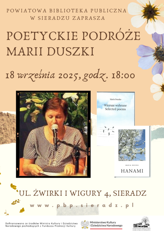 Któż wie o tym lepiej, niż Maria Duszka? 18 września w Powiatowej Bibliotece Publicznej w Sieradzu czytała wiersze z tomu „Hanami” wydanego w 2023 roku przez lubelskie Norbertinum i najnowszego, dwujęzycznego „Wiersze wybrane. Selected poems” wydanego w serii „Biblioteka LiryDram”. Przede wszystkim była to jednak opowieść o podróżach do miejsc ważnych i inspirujących, a przede wszystkim do ludzi wrażliwych na piękno słowa.