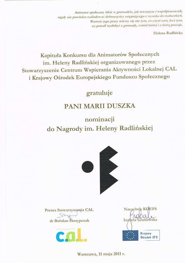 Zostałam nominowana do Nagrody im. Heleny Radlińskiej w konkursie dla animatorów społecznych.