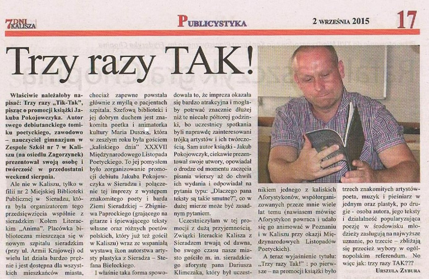 „Tik – tak” – to tytuł debiutanckiego tomiku poezji kaliskiego nauczyciela Jakuba Pokojowczyka. Autor na co dzień pracuje w Zespole Szkół nr 7 w Kaliszu. Zbiór wierszy ukazał się 15 lipca.