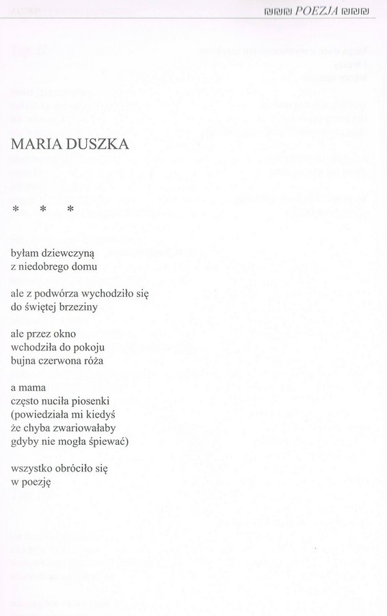 „Rzucając mi ciągle / kłody pod nogi / nawet nie wiesz / że buduję z nich most / by przejść / na drugą stronę”. Ten pełen stoickiej mądrości utwór może dawać nam pociechę i siłę w chwilach, gdy bardzo dokuczą nam bliźni. Jego autorką jest Magdalena Majoch. Wiersz ten został zamieszczony w antologii p.t. „Zetknięcia : linia, słowo, plama” wydanej w ubiegłym roku przez Zgierską Grupę Poetycką „Nietakt” oraz plastyków należących do Stowarzyszenia „Młyn”. Każdy z poetów opublikował w niej jeden utwór.