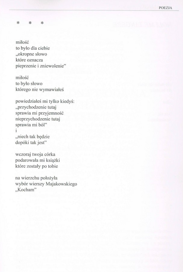 Wydaje się, że jest to motto wielu współczesnych poetów, którzy boją się odkryć, „objawić”. Nie potrafią lub nie chcą mówić o swoich uczuciach, zwłaszcza o miłości. Jeśli już, to mówią o niej stłumionym głosem, nieśmiałym szeptem. Albo piszą o uczuciach zranionych, podeptanych. Co ciekawe, częściej ostatnio zdarza mi się czytać wiersze o takiej tematyce pisane przez mężczyzn.